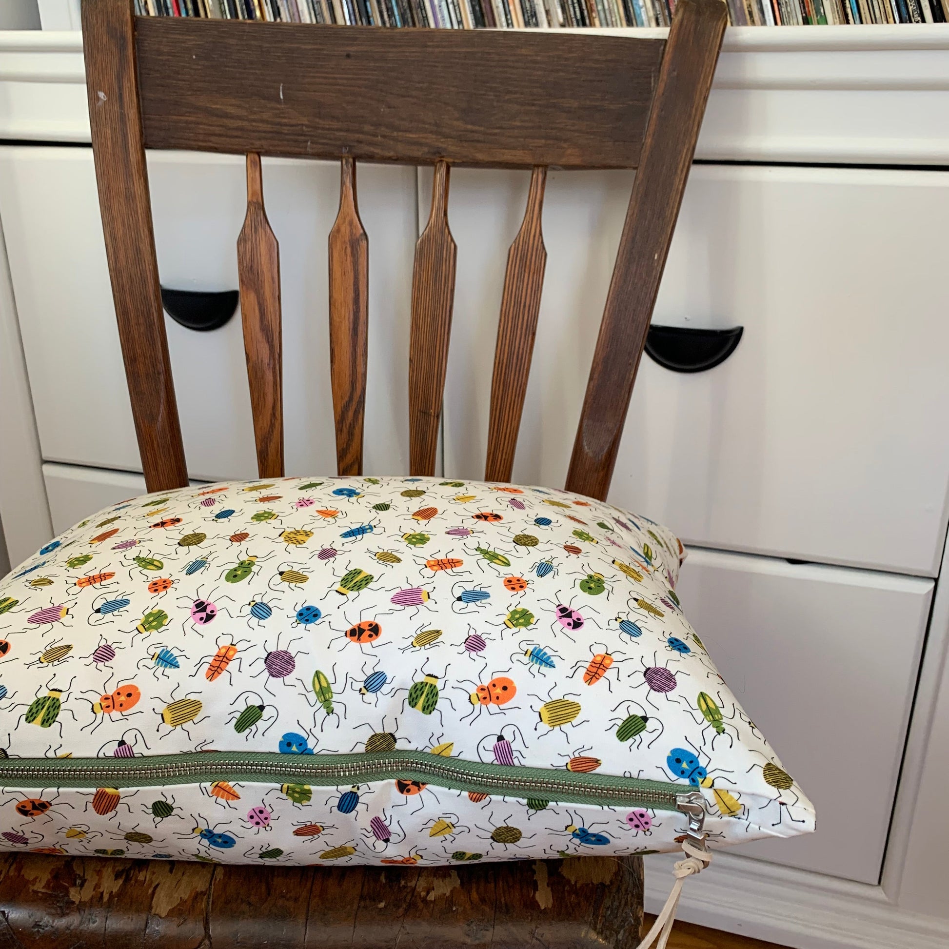 Handcrafted in Canada, this darling bug-patterned pillow is made from GOTS certified organic cotton. It's soft to the touch with an exposed green zipper adding a charming detail that complements the vibrant bugs and creamy backdrop. Bring a touch of playfulness and joy to your home, cottage, bunkie, or sunroom.