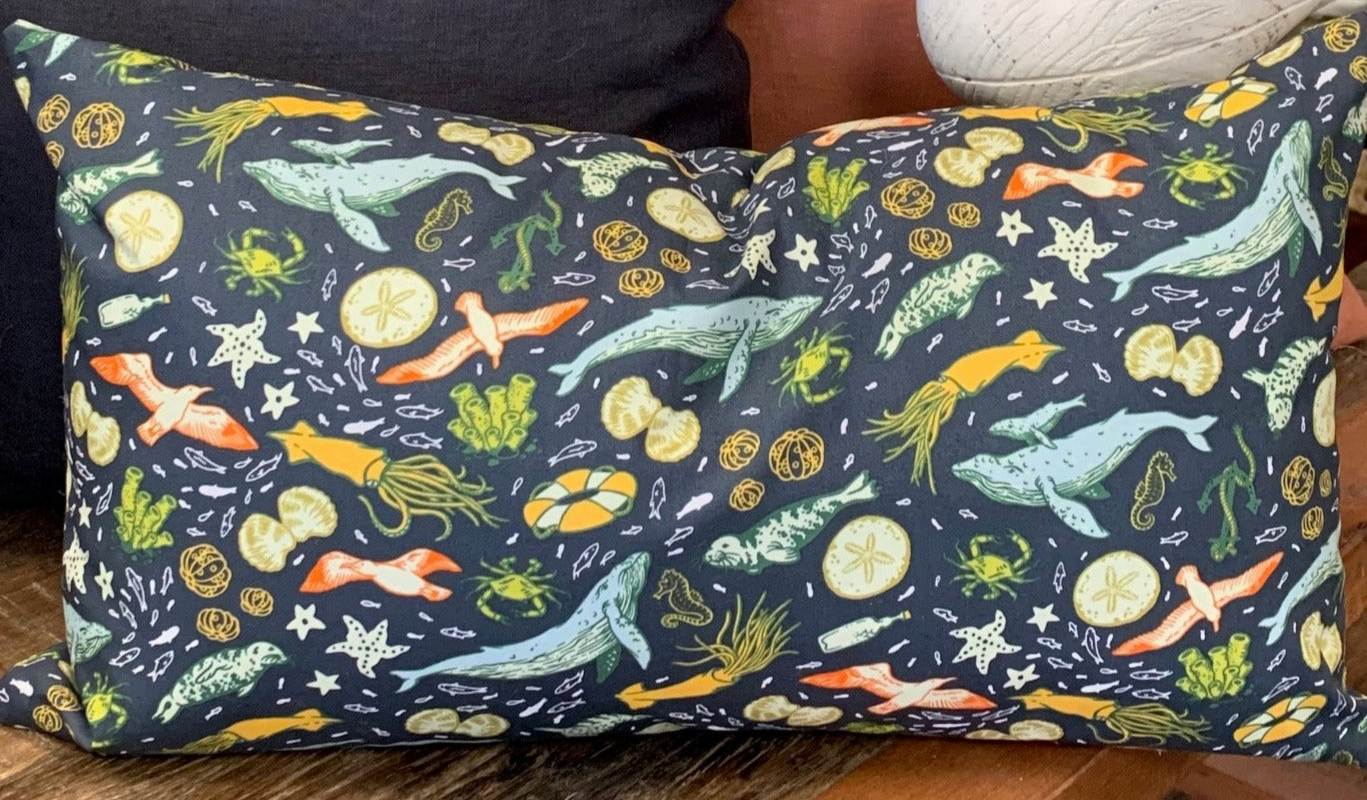 This soft organic cotton pillow cover depicts the diverse marine life off the B.C. Pacific coast. This pillow has an exposed, terracotta coloured zipper that contrasts beautifully with shades of blue and pops of orange and sea green. A beautiful accent in any home or cottage.