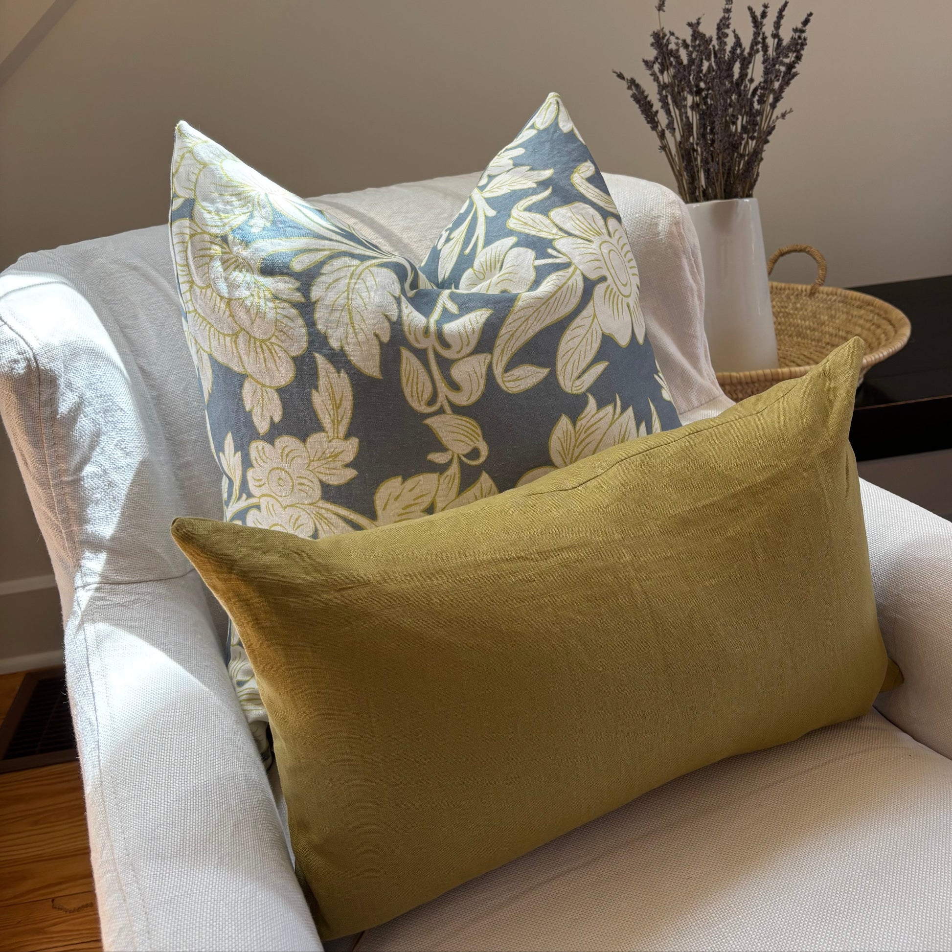 Luxurious yet casual, these pillow covers are made in Canada with sustainable Oeko-Tex® certified linen. This fabulous colour has a muted, muddy green vibe, we love it! This beautiful lumbar pillow with exposed zipper looks great with many colours especially creamy neutrals and Elodie Blooms floral pillow.