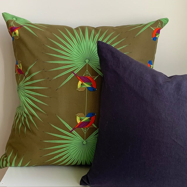 The Graphite Blue linen pillow cover looks beautiful with the Flamboyant Feathers Organic Canvas pillow cover.