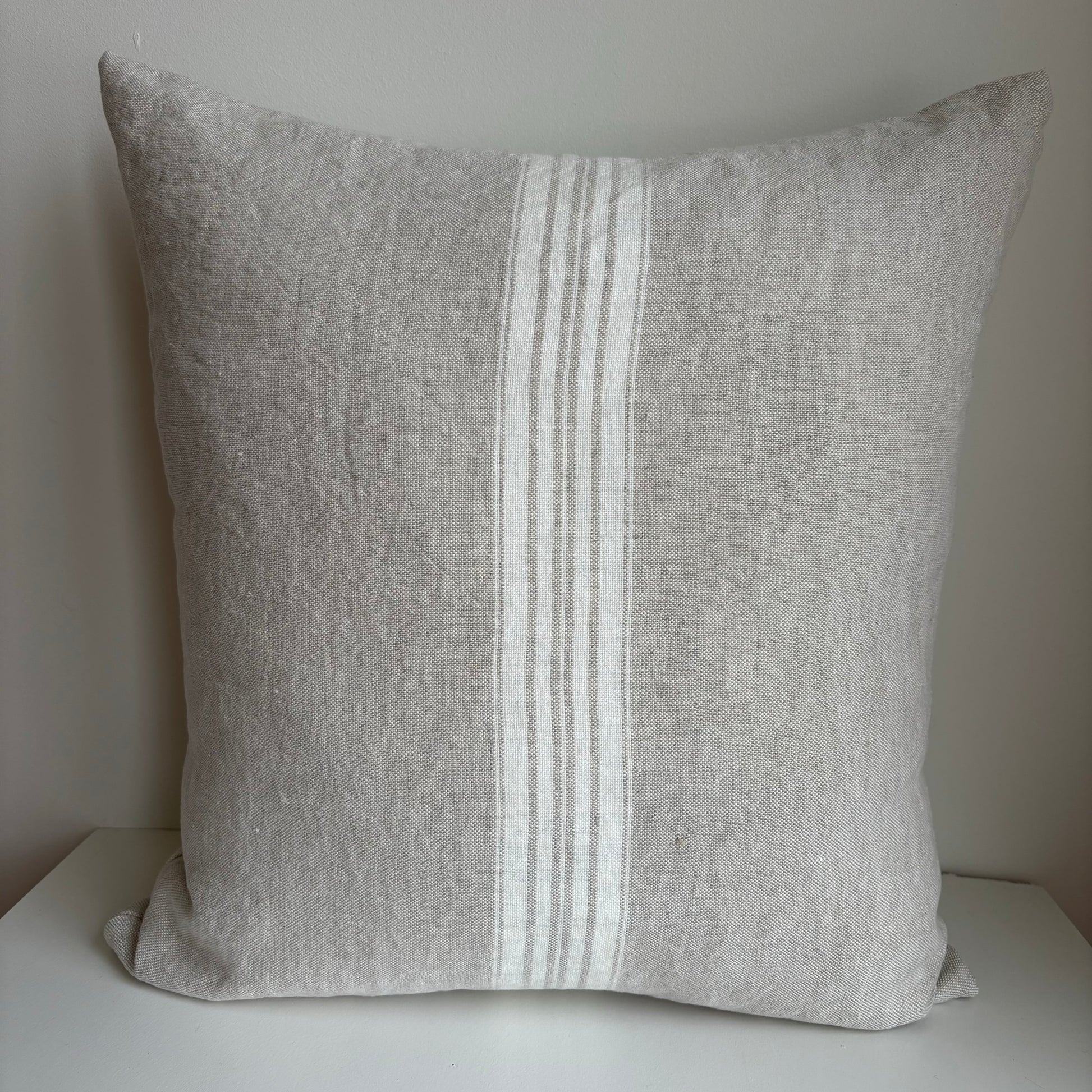 Stonewashed Linen Pillow 18 x18 - Beige with Cream Ticking Stripe and Exposed Zipper